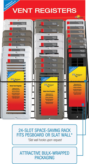 This new range is available in tan, white and black, dampered and undampered, metal and plastic. Ten sku’s in clean, attractive bulk-wrapped packaging. But the real kicker is our rack! It holds 24 vent registers and utilizes the "depth" dimension of your store fixtures. Simply slot them in and watch them sell. The result: 67% space reduction! So now you can repurpose that shelf space for other opportunities.