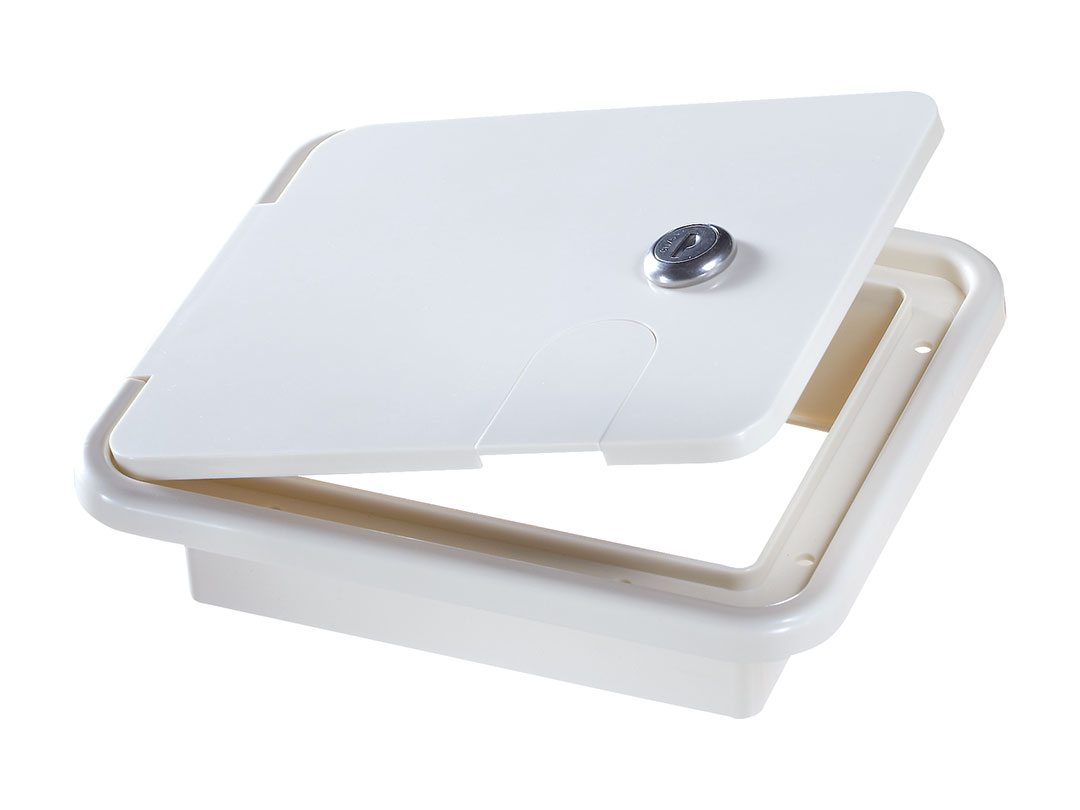Locking Cable Hatch, Rectangular, Polar White — 7.6″ x 6.5″ x 2″. Fits up to 50 Amp cord. Easy installation — same hole location and footprint as original equipment. 1 per pack.
