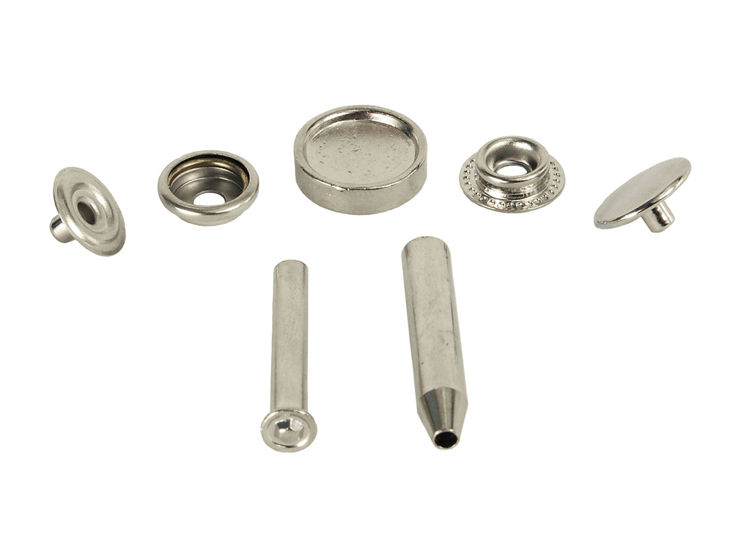 Snap Kit with tools (fabric to fabric). Each kit contains 6 complete fastener sets plus attaching tools to snap 2 fabric items together. 6 per pack.