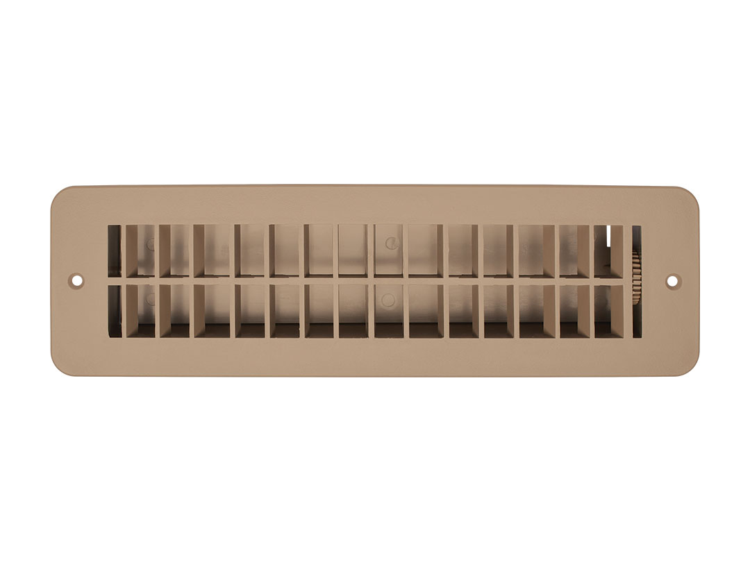 Tan plastic Vent Register. Dampered for choice of desired airflow. Cutout dimensions are 2.25″x10″. 1 per pack.
